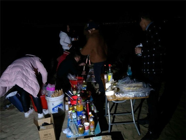 夜晚的沙滩烧烤,篝火晚会。