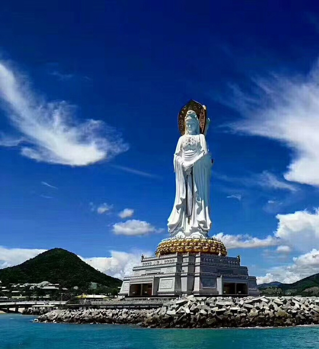 1993年中国国务院宗教局和海南人民政府批准兴建三亚南山寺,并在寺前的海中塑108米高之海上观音圣像,属于南山文化旅游区。此像由海南三亚南山海上观音功德基金会发心敬建,乃世界最大的白衣观音三面立体造像,巍峨壮观。