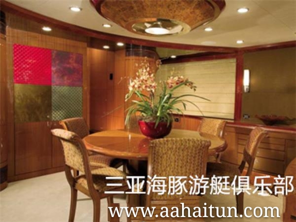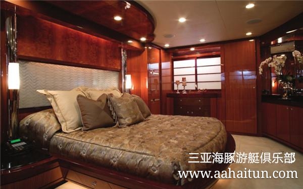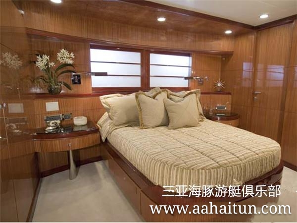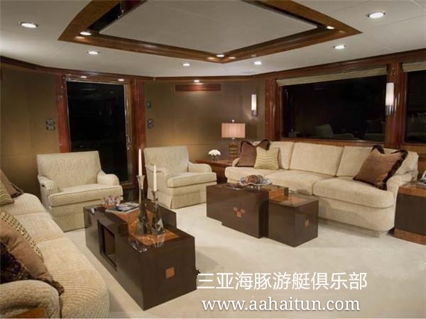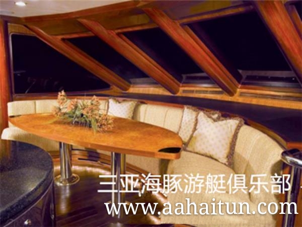 游艇主客厅巨大的沙龙里面陈设着2张沙发、四把可移动的椅子,和一个拥有冰箱、制冰机和葡萄酒冷却器的吧台。此外还有全套的影音娱乐设备。起居室有一张8人围坐的餐桌,你同样可以坐在酒吧台将艇内一览无余。这里还有一张办公桌。船头的小厨房兼吧台,设施一应俱全。在这里可以你可以同好友茗品美酒,共赏美景大厨房可以容下两个人一起工作,并且拥有全套的家庭生活所需的家电。这儿还另有两个冰柜、一个洗衣区。操舵室设有三座位的电动掌舵区,后面是一个小的沙龙区,驾驶舱后的甲板配备了钓鱼用的捕鱼诱饵箱、鱼竿和小椅子。四个客舱包括主人房和三间双人床客房,所有的客房都配有浴室和卫生间。主人房内还有大理石台面。
